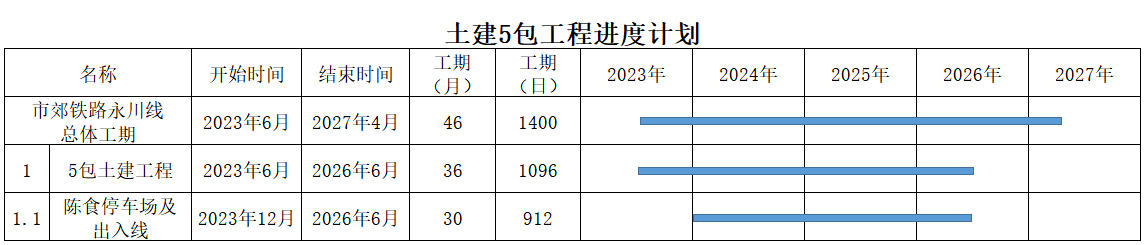 市郊鐵路重慶中心城區(qū)至永川線工程計(jì)劃施工總工期60個(gè)月。本招標(biāo)項(xiàng)目計(jì)劃于2023年6月30日開(kāi)工,計(jì)劃1096日歷天按合同約定實(shí)施和完成本承包工程。