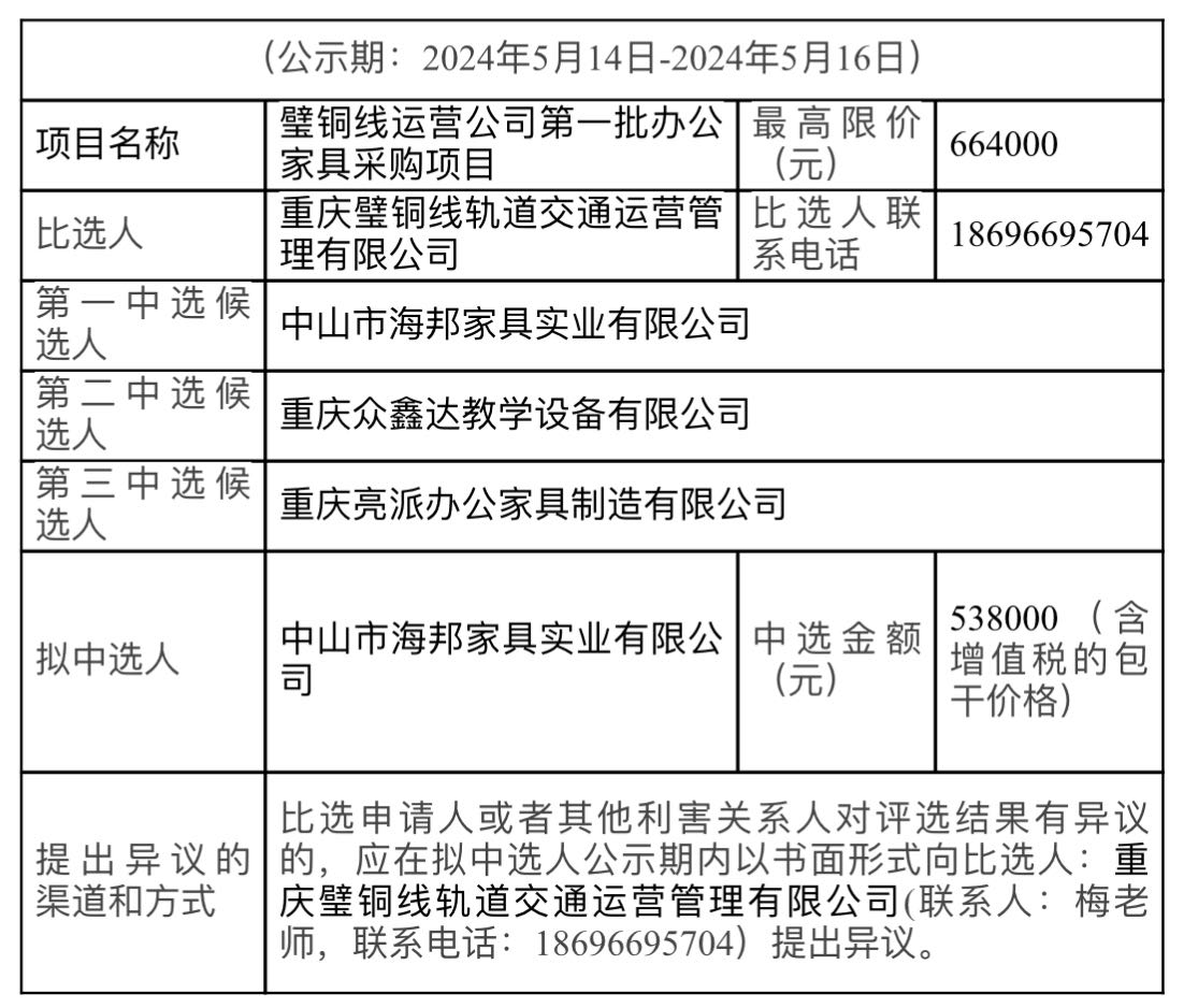 璧銅線運(yùn)營公司第一批辦公家具采購項目競爭性比選結(jié)果公示表