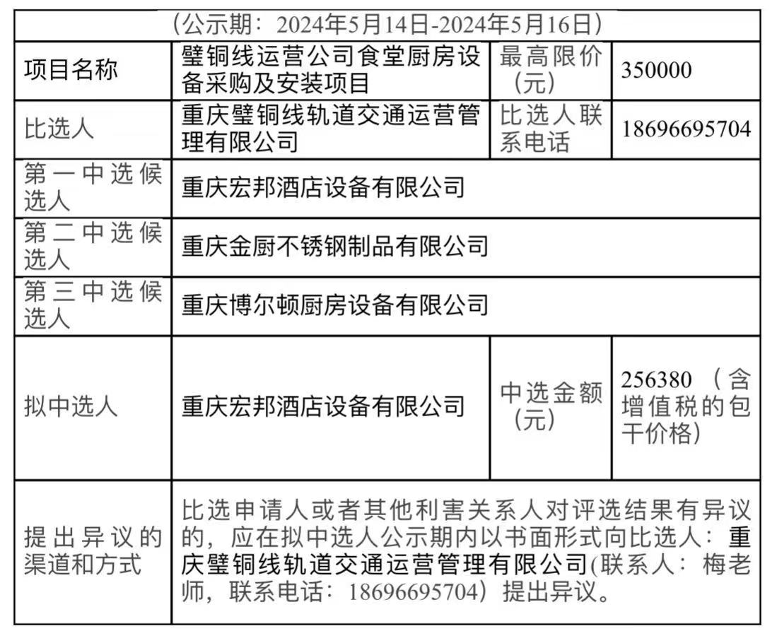璧銅線運(yùn)營(yíng)公司廚房設(shè)備采購(gòu)及安裝項(xiàng)目競(jìng)爭(zhēng)性比選結(jié)果公示表