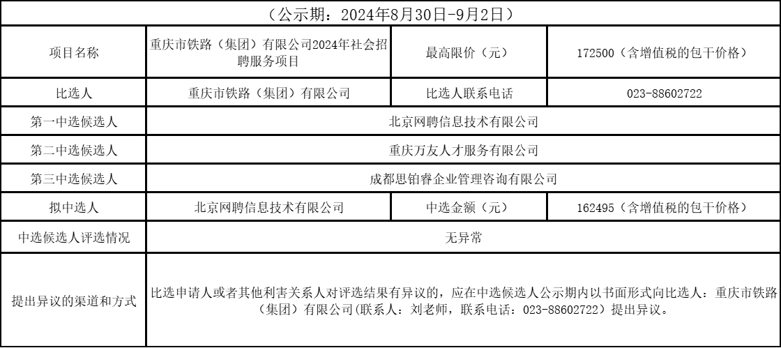 重慶市鐵路(集團(tuán))有限公司2024年社會(huì)招聘服務(wù)項(xiàng)目競(jìng)爭(zhēng)性比選結(jié)果公示表