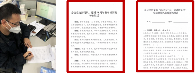 活動簡介:為與時俱進深入學習貫徹黨的二十大精神,用黨的創(chuàng)新理論武裝黨員干部頭腦、指導工作實踐,10月24日,辦公室黨支部開展了“學習貫徹黨的二十大精神,推動辦公室工作創(chuàng)一流業(yè)績”主題黨日活動?;顒又?,再次學習了黨的二十大報告、習近平總書記近期重要講話精神,討論了黨費收繳、意識形態(tài)工作、廉政建設、入黨積極分子培訓等事項,開展了“建國73周年,我對祖國說句心里話”活動和“喜迎二十大,奮進新征程”黨建暨黨風廉政建設知識測試。