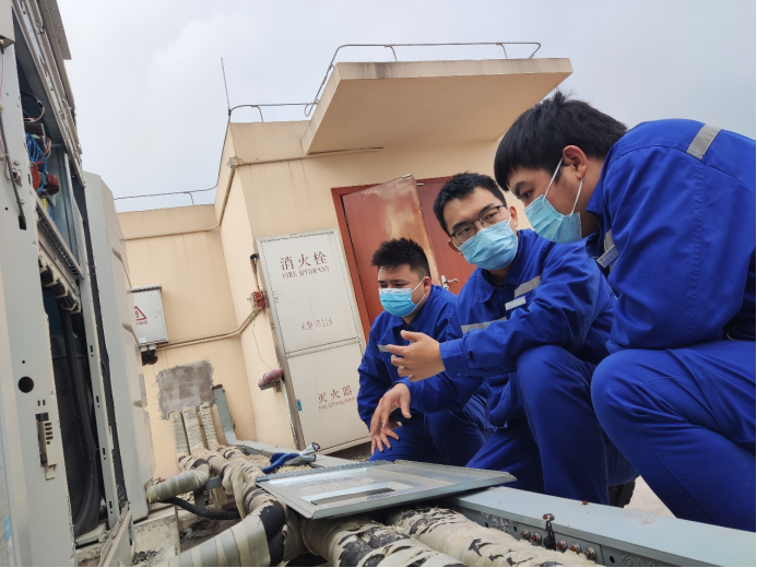 產(chǎn)業(yè)公司江跳線維管項目部車輛段機電工班工班長、團(tuán)員青年彭成正在教工班人員空調(diào)多聯(lián)機故障處置