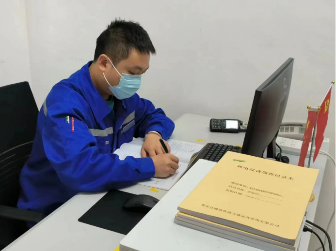 產(chǎn)業(yè)公司江跳線維管項目部九龍園機電工班組長、團(tuán)員青年陳俊男正在填寫值班當(dāng)日機電設(shè)備巡檢記錄