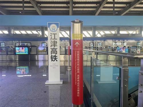 在江跳線車站站臺的立柱或墻上,有一個紅色的“小按鈕”,這是列車緊急停車按鈕。當(dāng)發(fā)生屏蔽門和車門之間夾人夾物等危險情況時,可及時按壓該按鈕,停止列車的啟動。