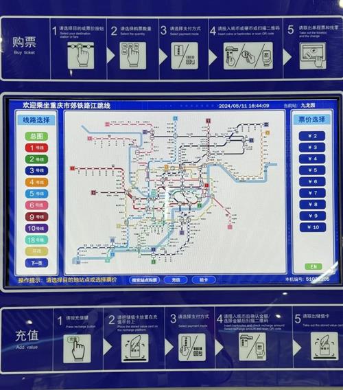 TVM,全稱叫做“自動售票機”。TVM最下方的第一個選項為“搜索站點購票”,輸入站點首字母即可快速鎖定目的站點,(例如:目的站點為“小什字”即輸入XSZ)。第二個選項為“充值”,選擇現(xiàn)金、微信、支付寶進行支付。第三個選項是“驗卡”,可以快速查詢卡內(nèi)余額。主屏幕上還呈現(xiàn)有重慶市完整的軌道交通線路圖,可縮小放大,便于大家更好地規(guī)劃出行路線。